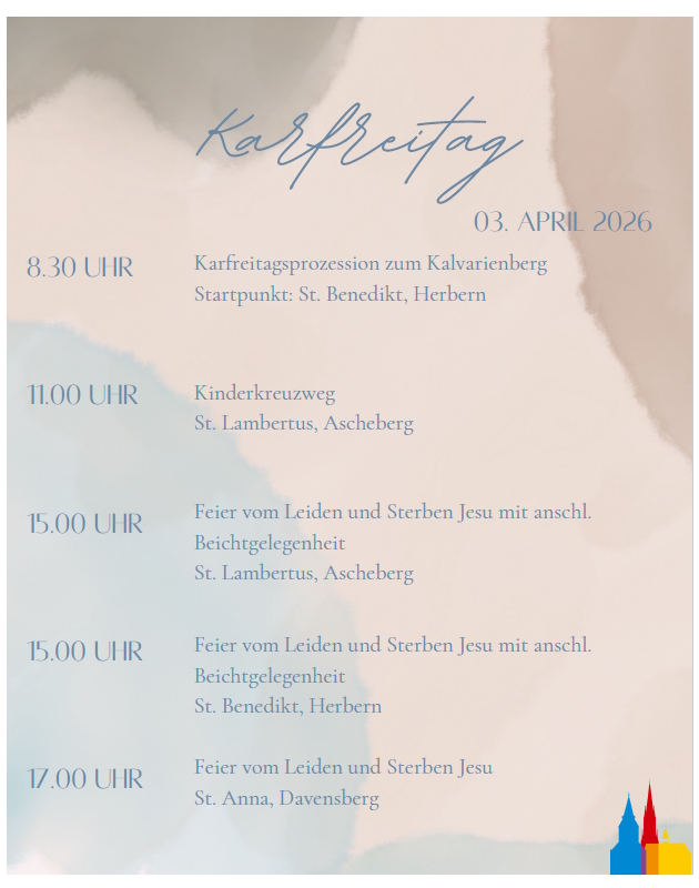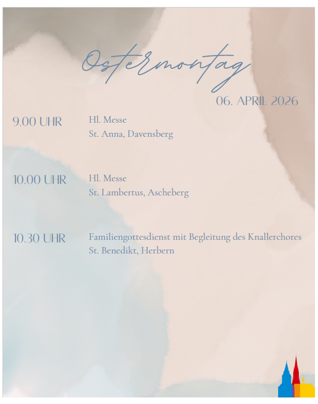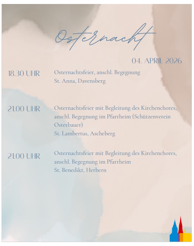 Ganz herzlich heißen wir Sie auf der Website der Kirchengemeinde St. Lambertus Ascheberg willkommen. Hier erhalten Sie Informationen zu unserem Gemeindeleben in Davensberg, Ascheberg und Herbern. Gern sind wir auch persönlich für Sie da, per Telefon oder beim Besuch in den Pfarrbüros. Telefonnummern der Büros und deren Öffnungszeiten finden Sie ganz unten auf dieser Seite. Weitere Unterseiten finden Sie oben rechts im Menüpunkt.